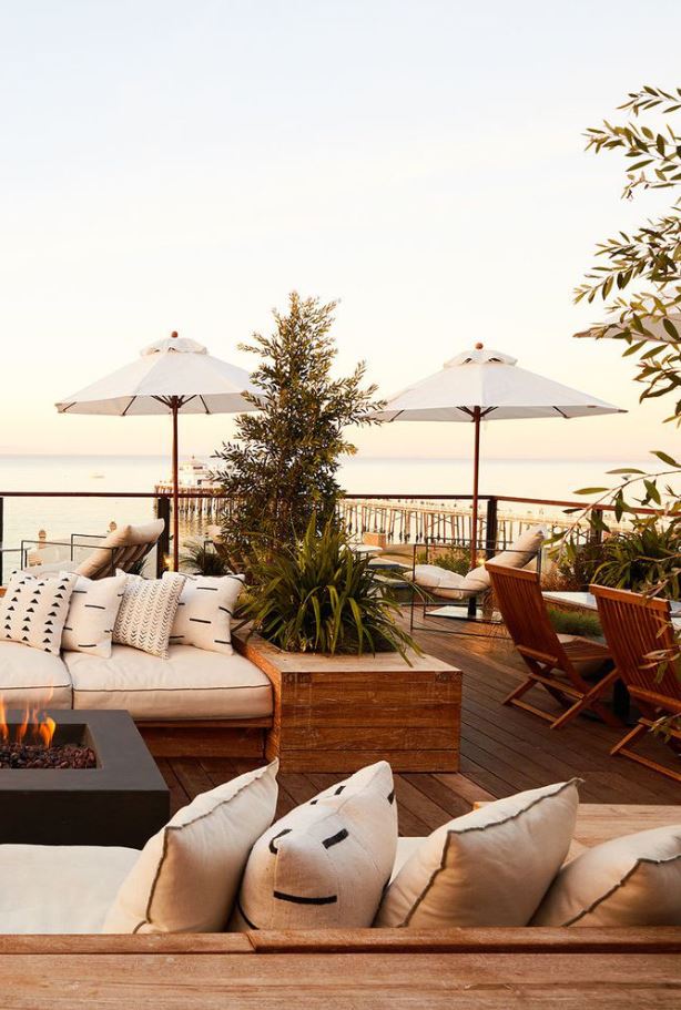 Installez un poêle à bois sur votre terrasse pour une ambiance plus agréable. Pour canaliser cette esthétique côtière moderne, optez pour des teintes neutres, des lignes design et des coussins graphiques. Le brasero en corten est l’accessoire en vogue du moment !