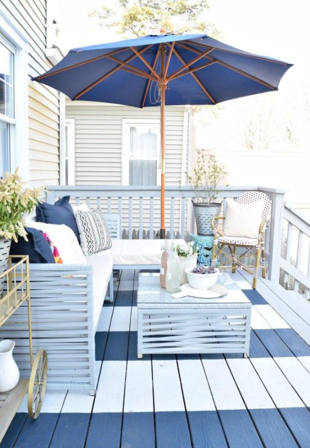 Si vous avez une maison côtière, vous pouvez peindre votre terrasse en bleu et blanc rayé. Ajoutez des chaises avec coussins – un ensemble de jolis bouquets, et le tour est joué !