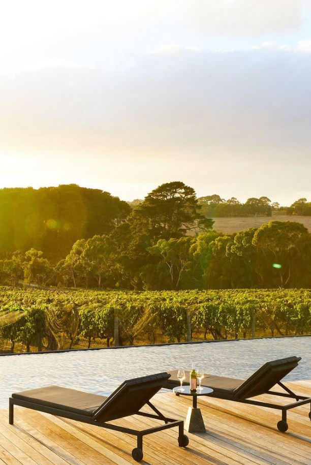 Le minimalisme et le design épuré de la piscine à débordement permettent à nos yeux de se concentrer sur la vue magnifique et les étendues sur le vignoble qui s’ouvre devant nous. Ces chaises longues sont l’endroit idéal pour déguster un verre de vin au coucher du soleil.