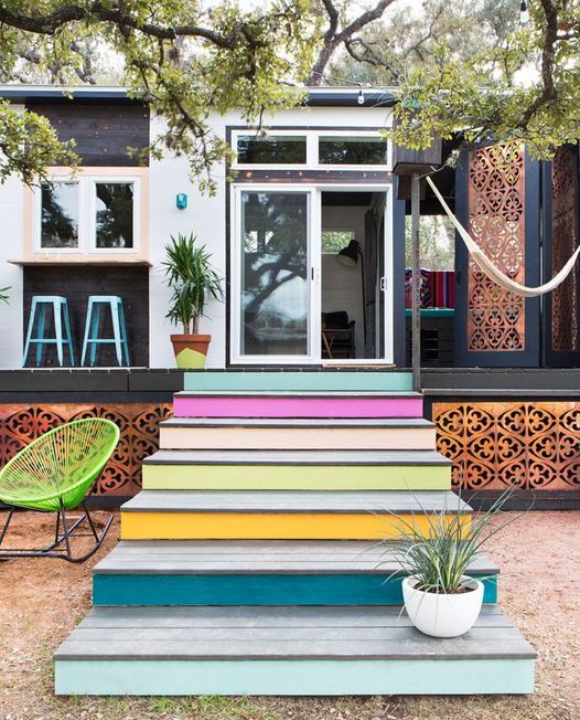 Attirez l’attention vers le haut avec des contremarches d’escalier accrocheuses et colorées – c’est une façon facile et percutante d’incorporer de la couleur. Nous aimons aussi la façon dont le panneau de bois gravé entre le sol et la terrasse est le même matériau que la porte, introduisant de la texture et créant une vraie cohésion d’ensemble.