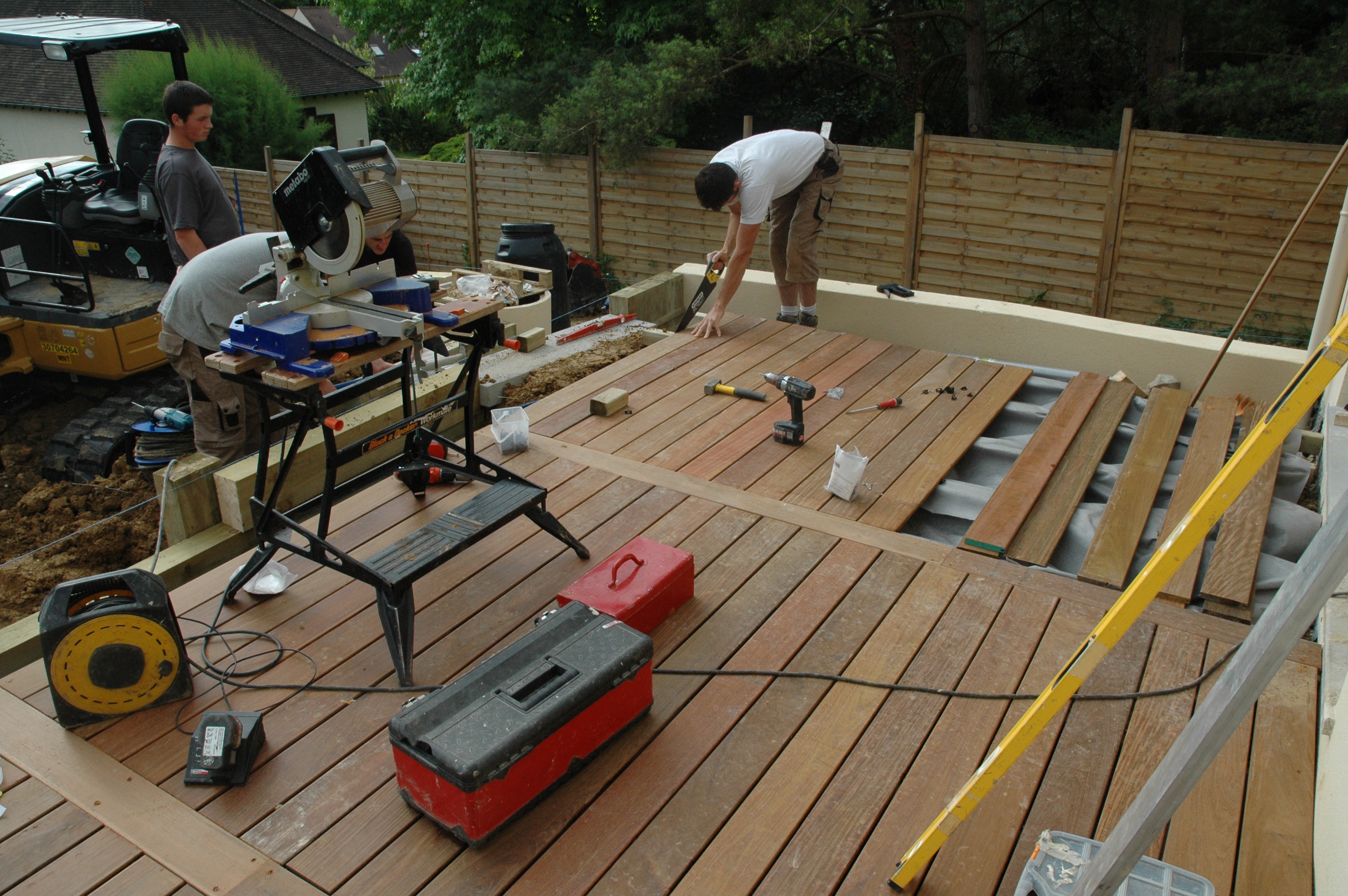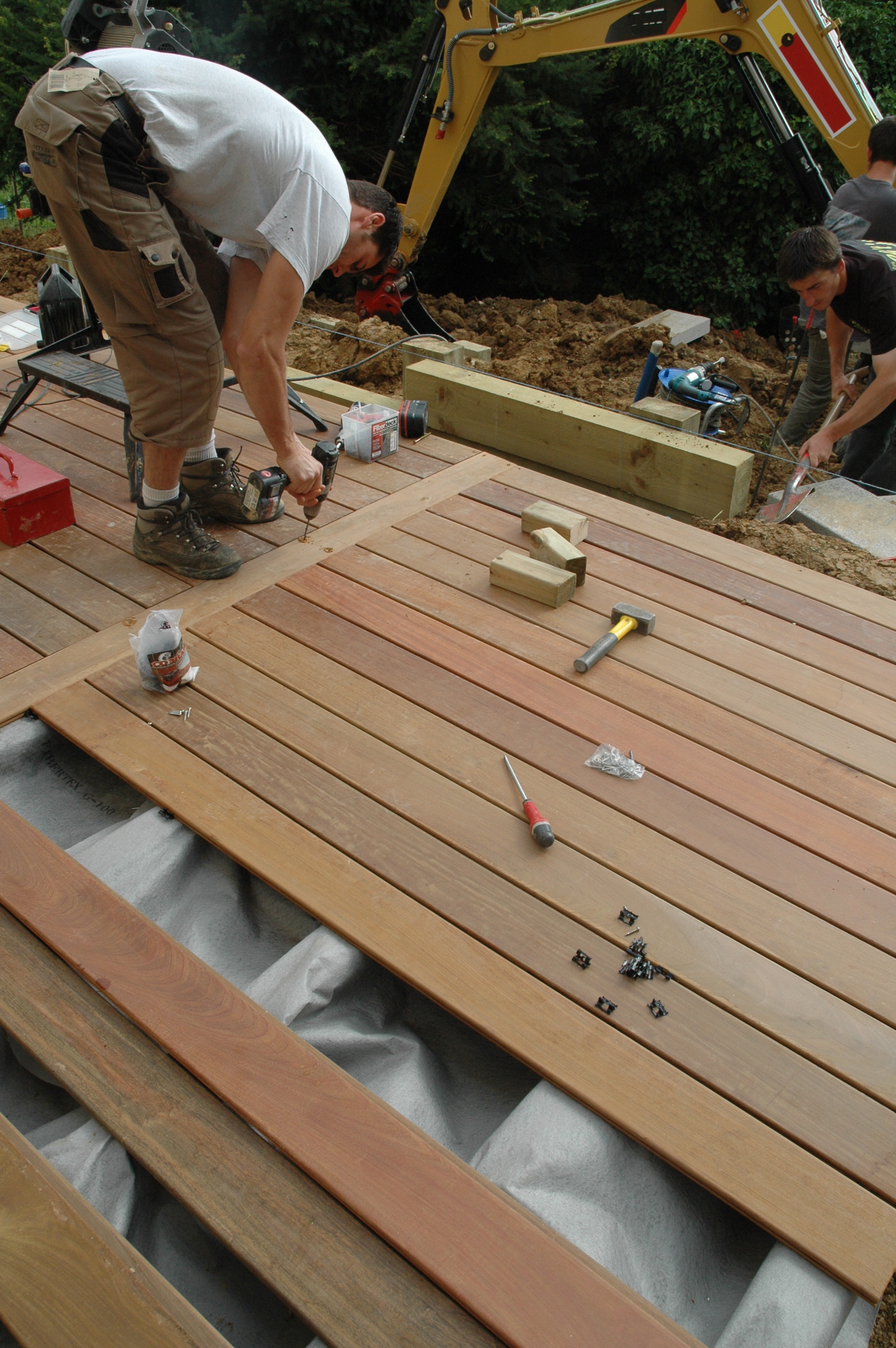 Une pose de la terrasse sur plots réglables et sur chevrons en pin traitées de 60x80mm. L’application d’un feutre géotextile de 100gr/m2 permet d’éviter la remonté de végétation à travers les lames.